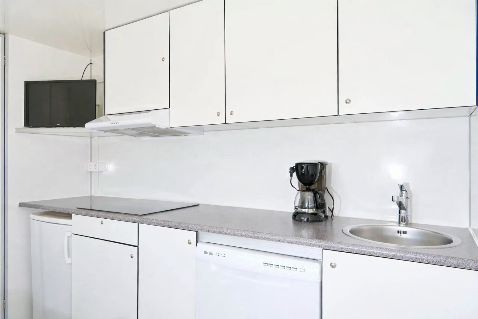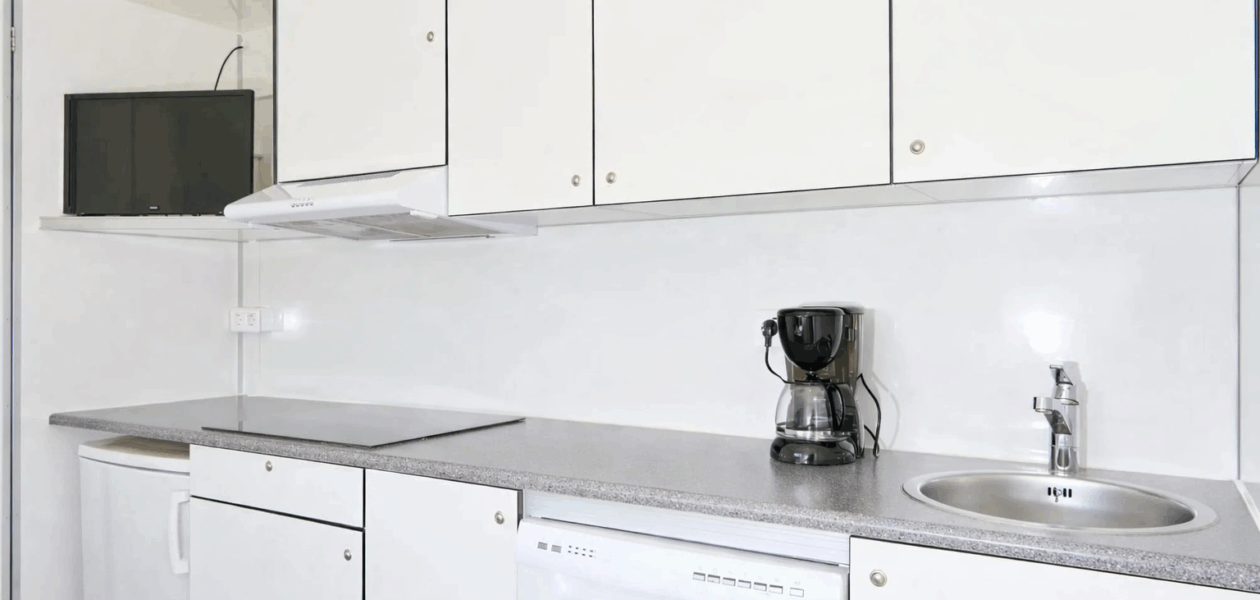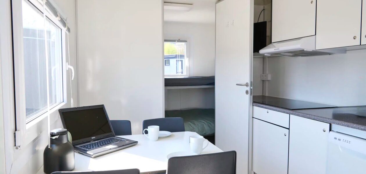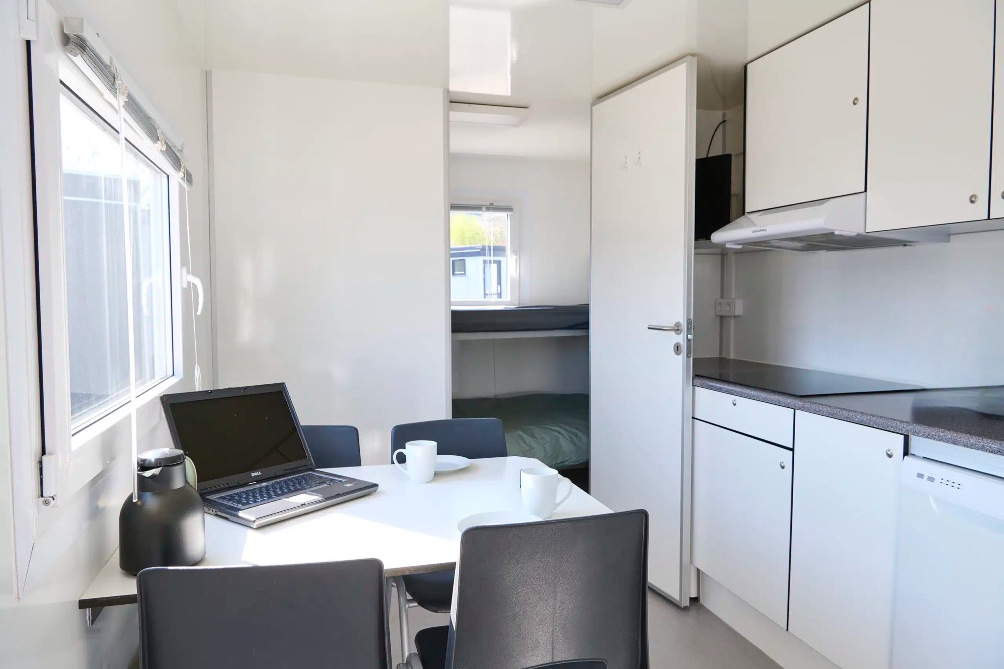 Opholdsrum med køkken og spiseplads til 4 personer, forgang, 2 soverum og komplet badeværelse m/kværn. Der er monteret TV.